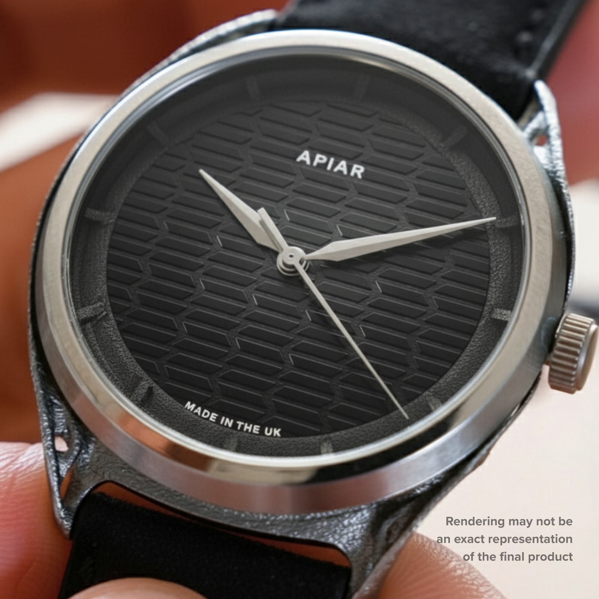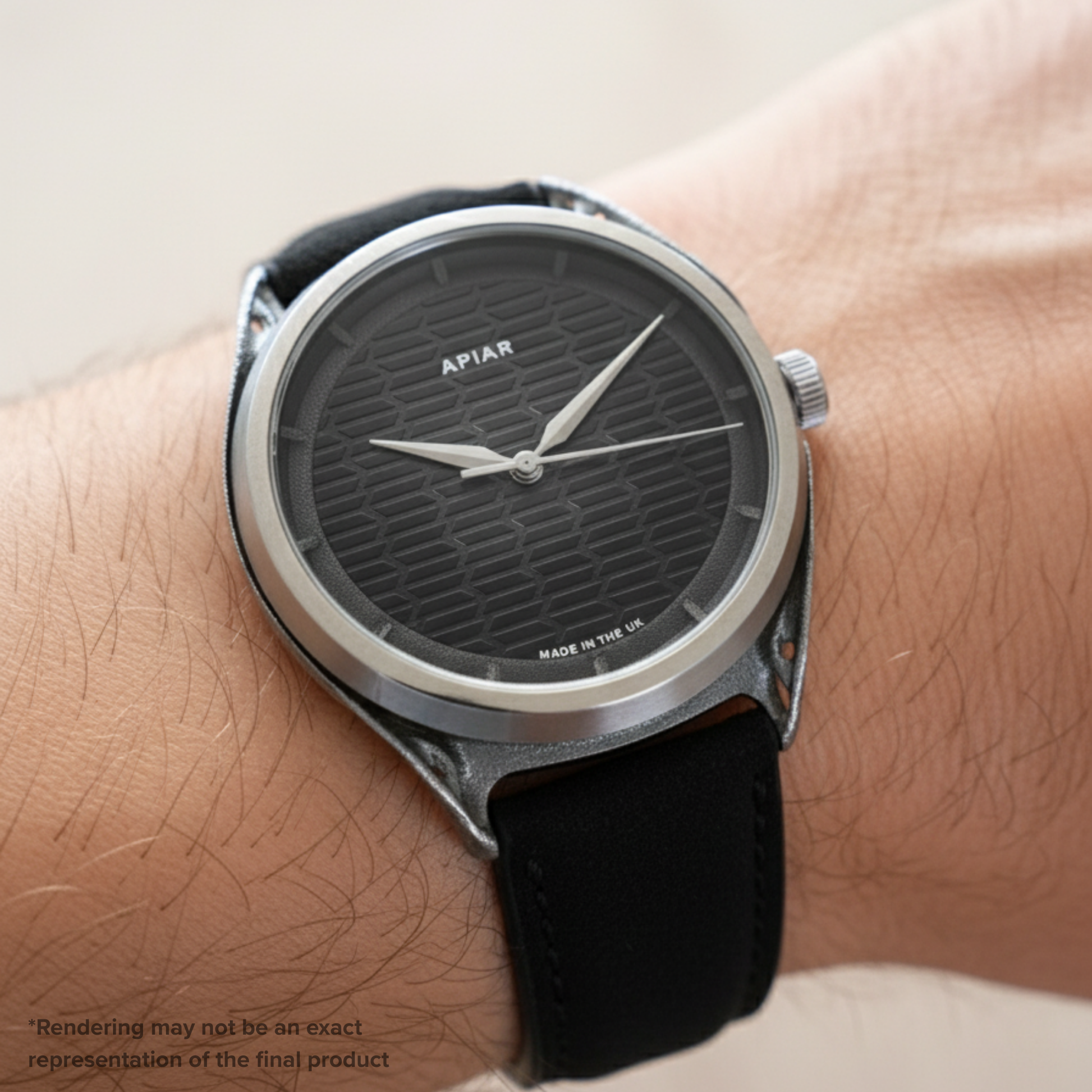 The dial of the Gen1.0 MR² takes inspiration from Max Resnick’s journey into the Solana ecosystem. From the beginning we knew we did not want to just drop a logo on the dial, as others have done... Looking at you Franck Muller. Instead, the Solana mark was re-imagined as a CNC-milled pattern, finished with sand-blasted and high-polished surfaces beneath a tinted lacquer. The result is a subtle grey dial with strong legibility and a refined play of light, a tasteful nod to Solana that still feels true to Apiar’s engineering-led design.