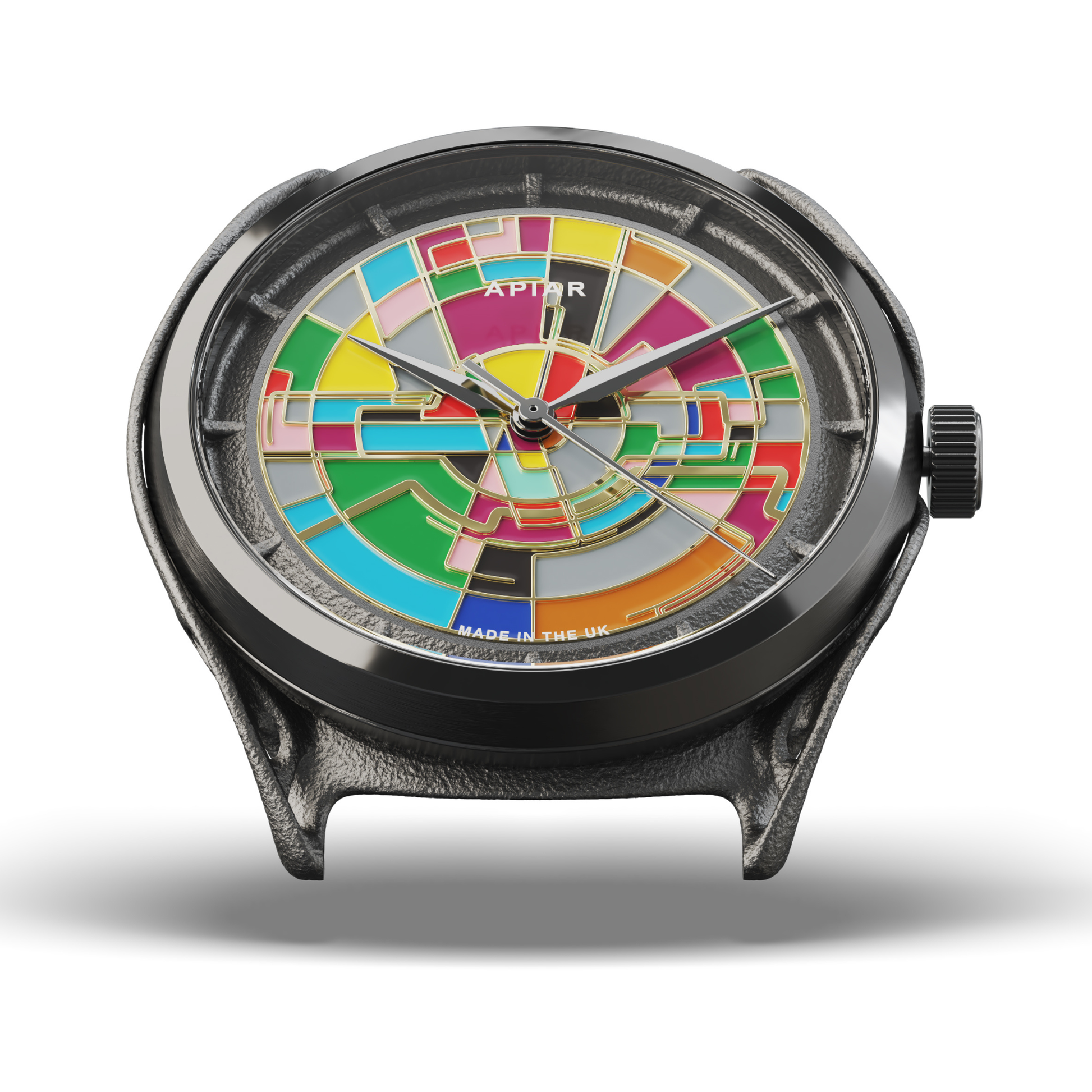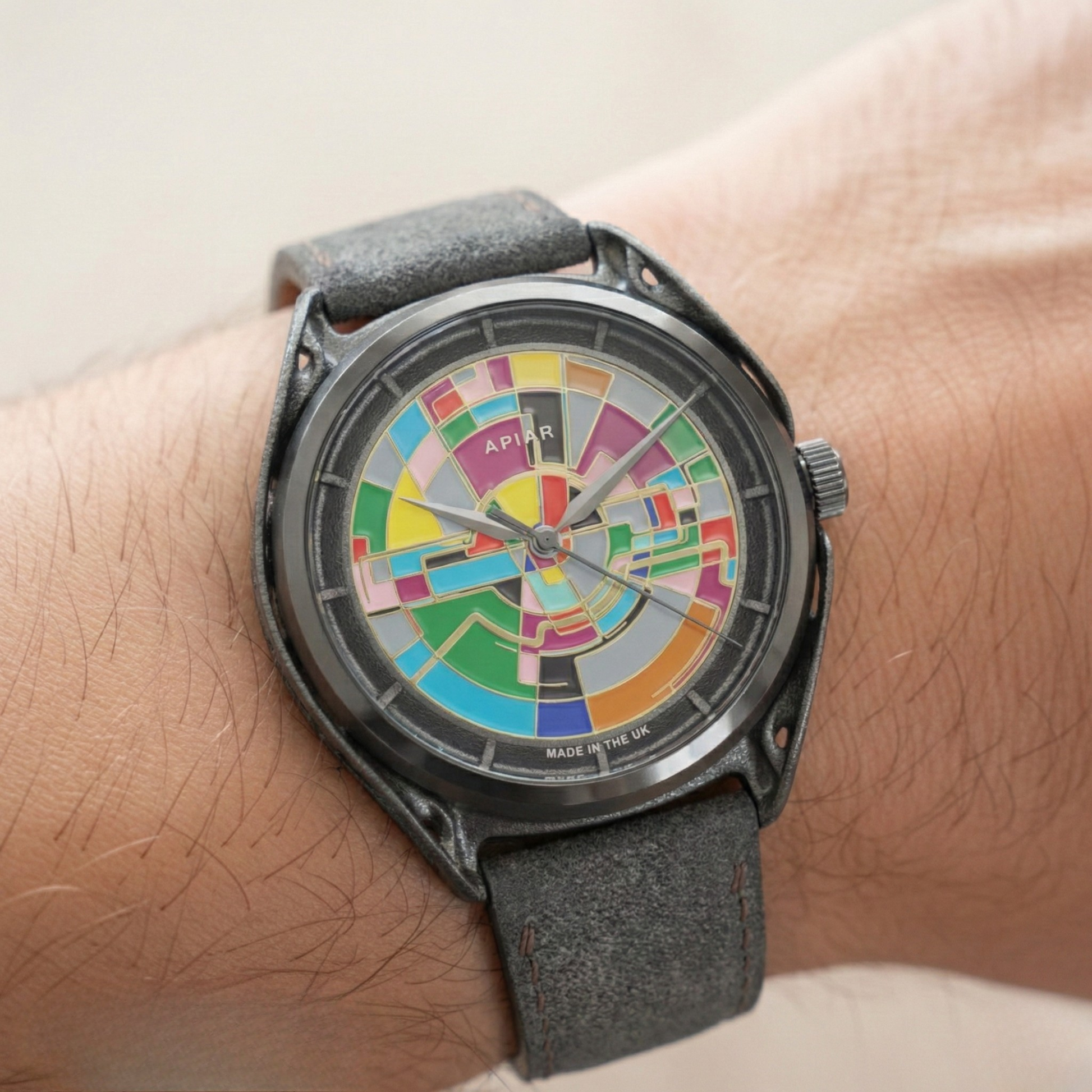The dial begins as a CNC-machined brass blank, laser engraved and then hand-filled with enamel paints by dial artist Chris Alexander using colours drawn from the London Underground lines. Each dial is coloured freely by hand, ensuring both watches are completely unique.
