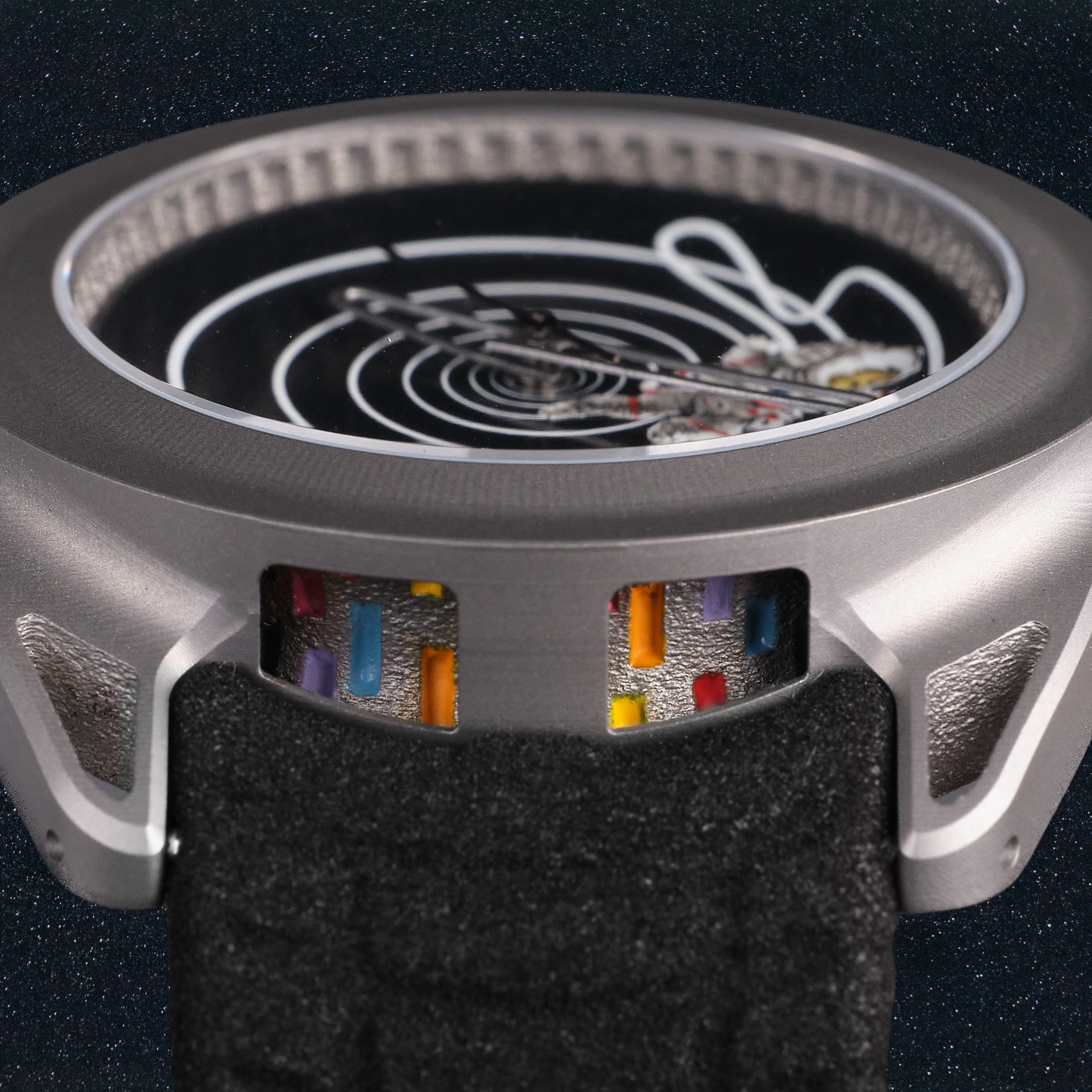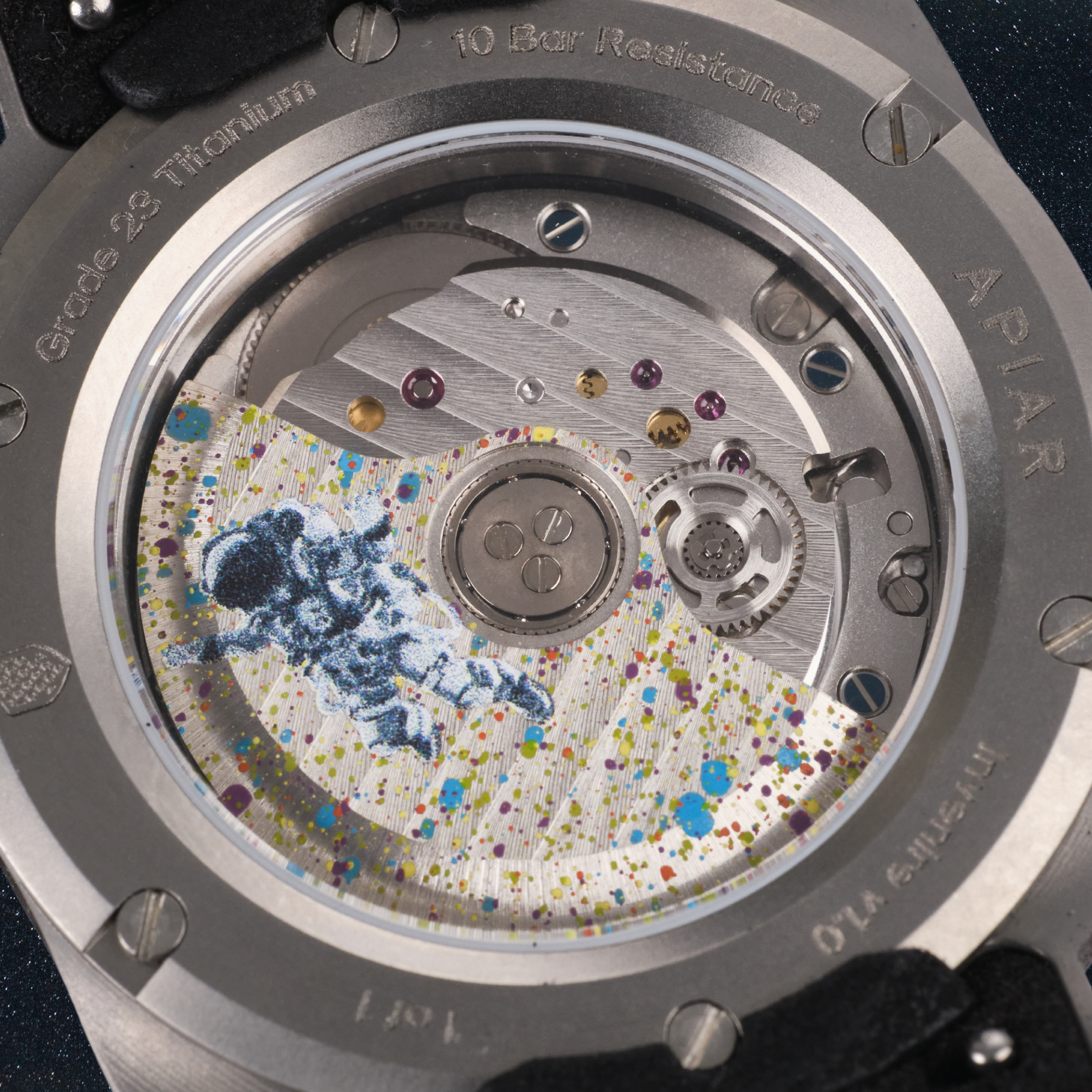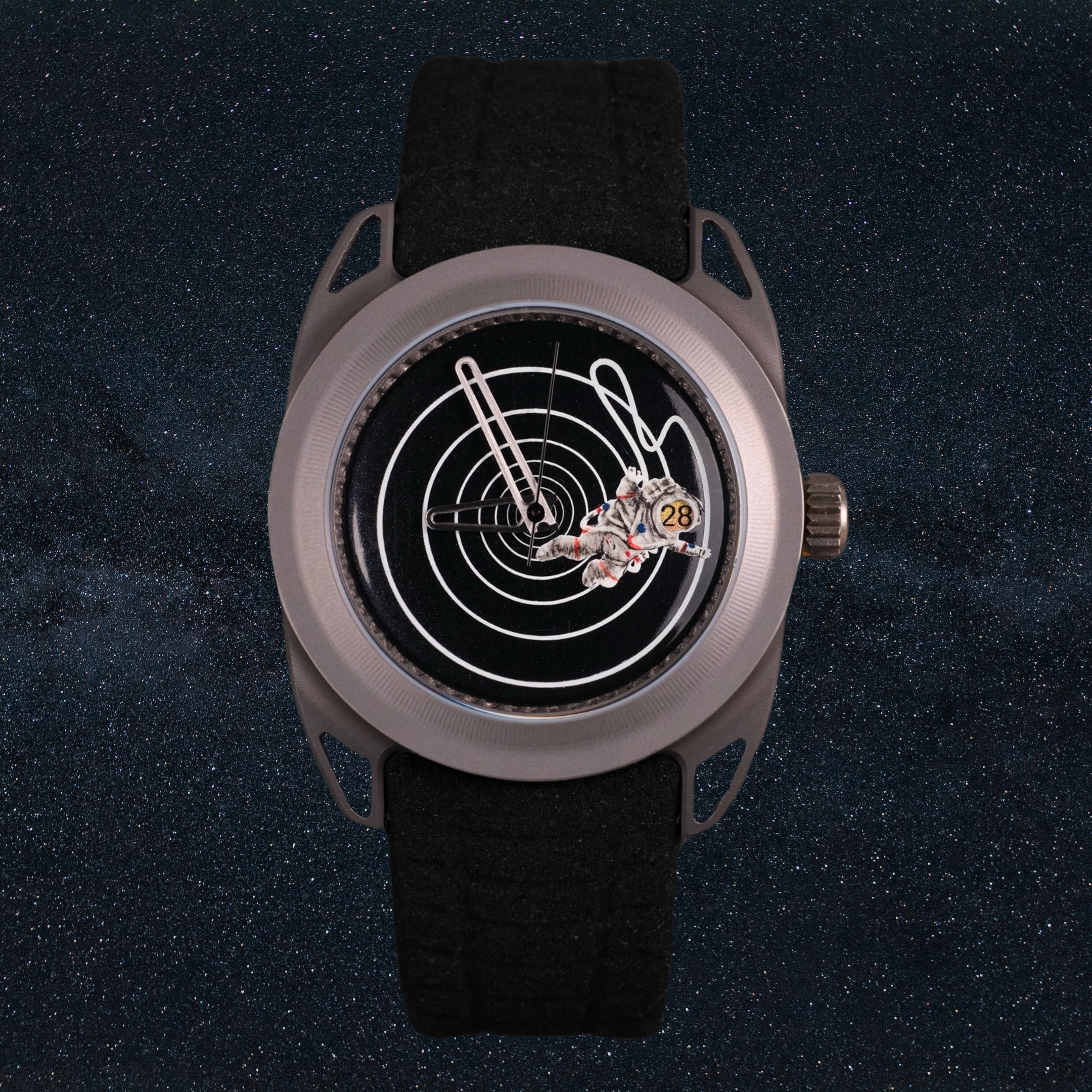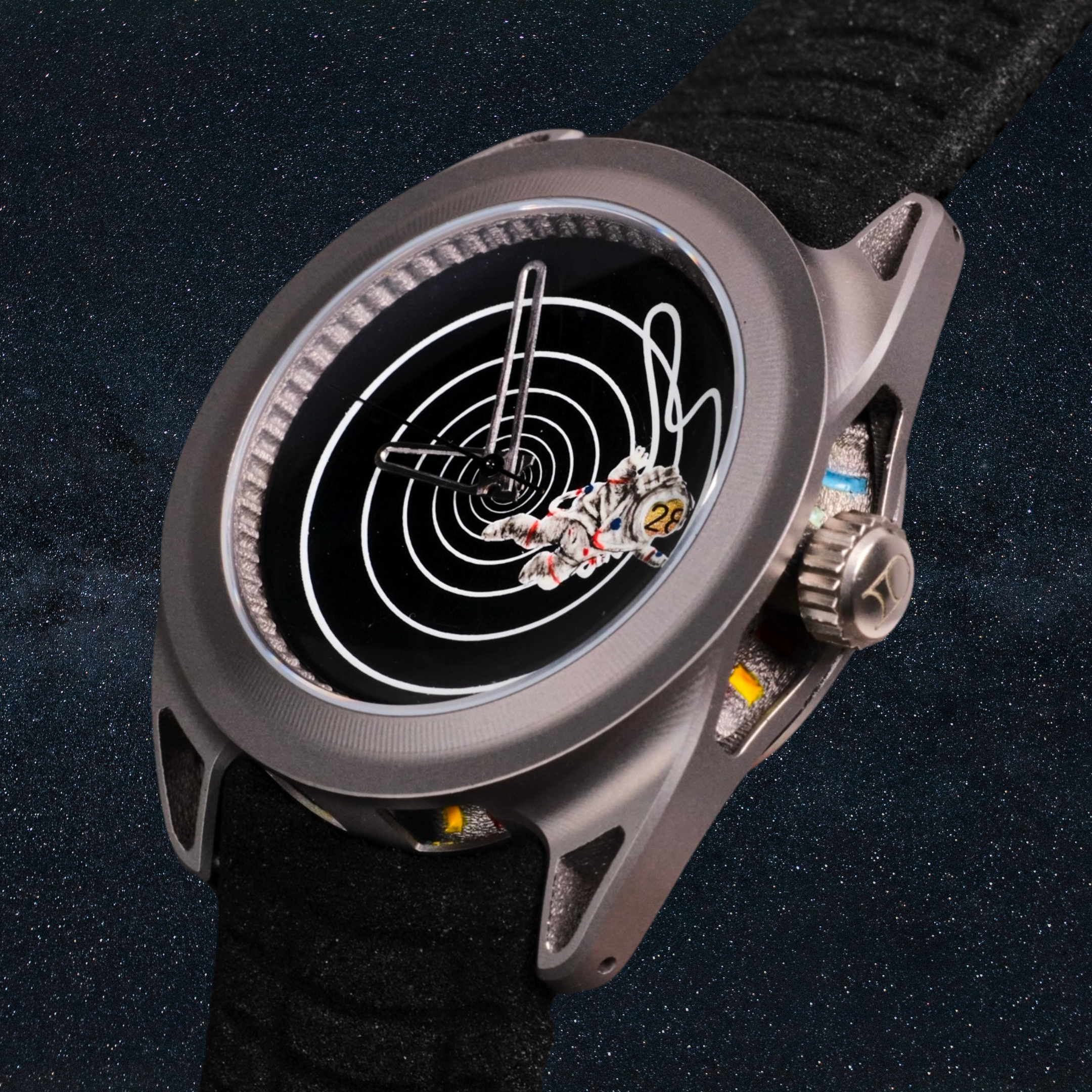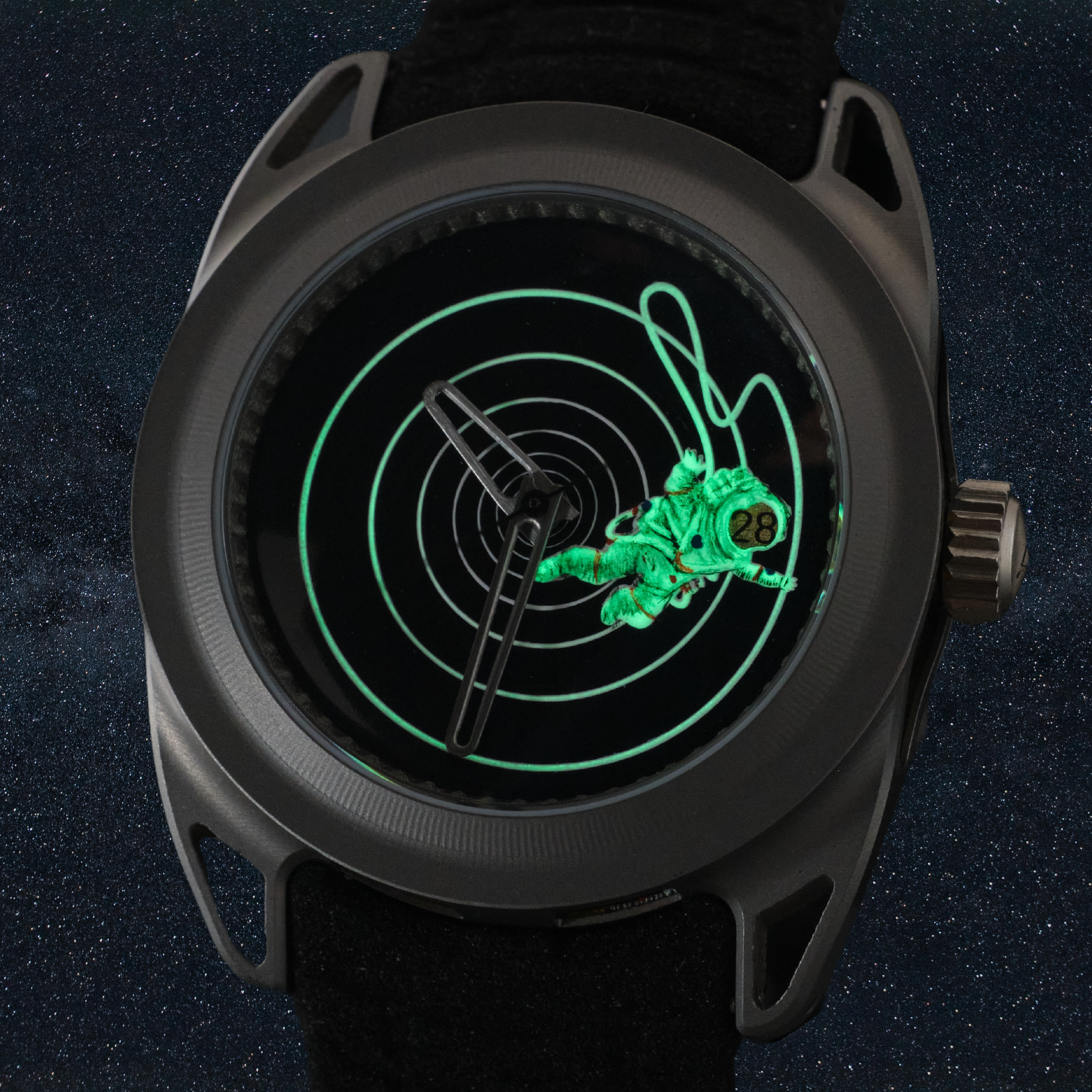 Designed to embody the concept of a wormhole from front to back, the ERB’s dial is a masterpiece of art and engineering. Chris, AKA @thedialartist, paints by hand the astronaut figure being drawn into the centre of the dial, symbolising the start of its cosmic journey through the watch case. This artistic detail truly brings the theme of interstellar exploration to life, making each ERB a unique, collectible and somewhat playful timepiece.